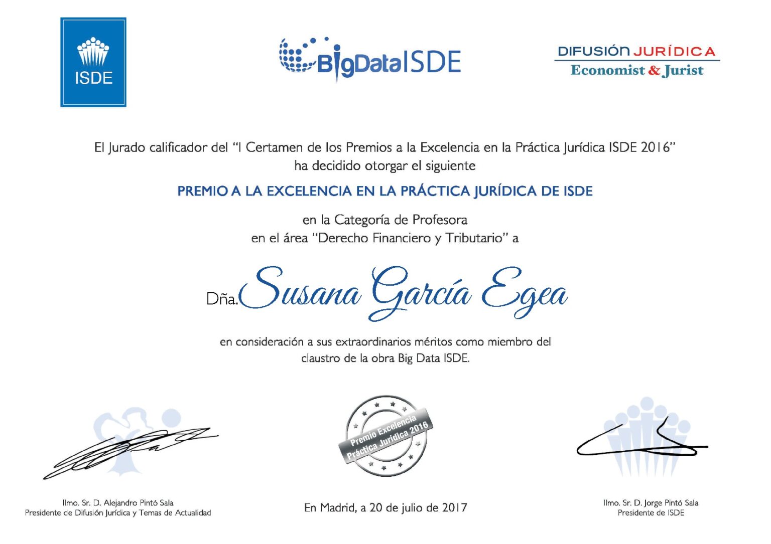 BUFETE – Bajo la dirección de la letrada Doña Susana García Egea, Profesora en la redacción de la obra digital Big Data Jurist y Coodirectora del Área de derecho Mercantil, y miembro del jurado en del Área de derecho Mercantil en el“I Certamen de los Premios a la Excelencia en Práctica Jurídica ISDE” de la obra académica de práctica Jurídica Big Data Jurist, que en su primera edición, celebrada el 20 de julio 2017 en el palacete DUQUE DE PASTRANA DE MADRID con seis nominaciones en las áreas civil, laboral y fiscal y GALARDONADA CON EL PREMIO como PROFESORA en la rama de derecho tributario y financiero 2016.